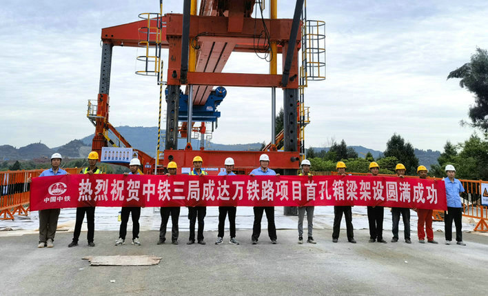 6月6日,在中鐵三局成達(dá)萬高鐵站前9標(biāo)架梁施工現(xiàn)場(chǎng),隨著首孔長(zhǎng)32米、重達(dá)約700噸的箱梁穩(wěn)穩(wěn)落在黃花村河舒河特大橋49#臺(tái)—48#墩上,標(biāo)志著由集團(tuán)公司承建的成達(dá)萬高鐵箱梁架設(shè)施工正式啟動(dòng),線路建設(shè)迎來重要進(jìn)展。