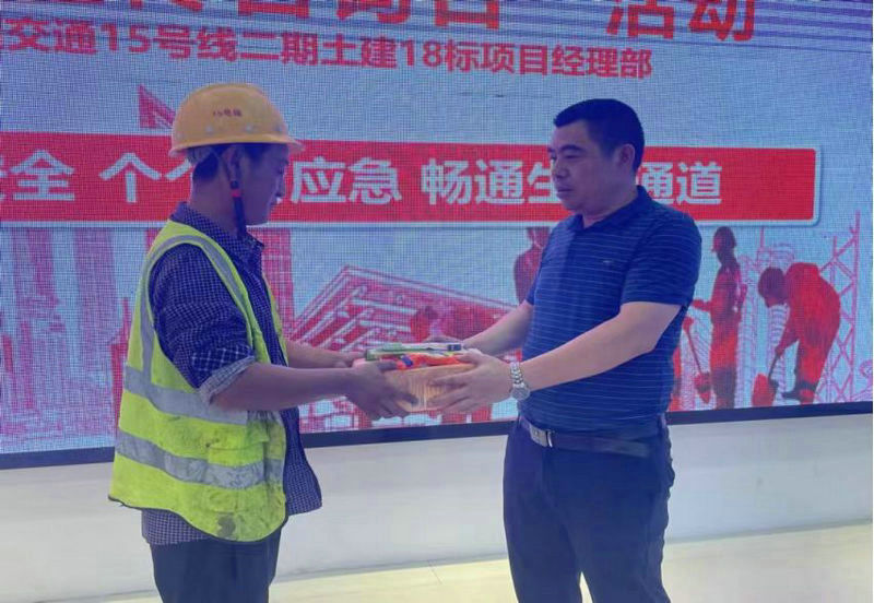 18標(biāo)項(xiàng)目部開展安全有獎(jiǎng)問答活動(dòng),項(xiàng)目書記李均強(qiáng)(右)為員工發(fā)獎(jiǎng)品