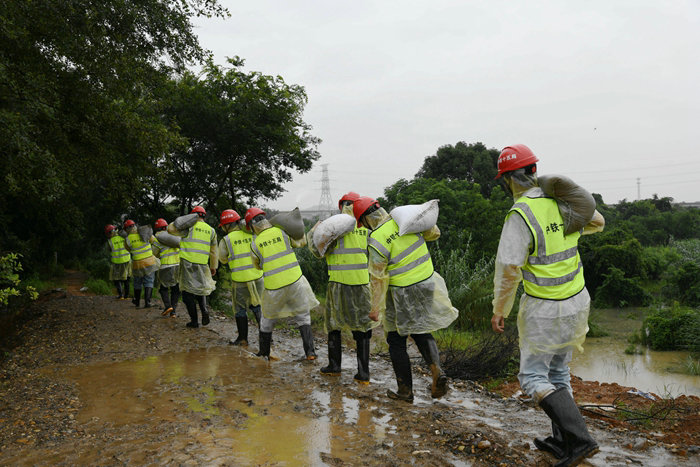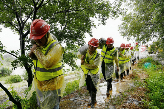 他們分工明確,搶險救援有條不紊地進(jìn)行。為了古縣畈村群眾的安全,搶險隊(duì)員忠實(shí)履行央企社會責(zé)任,在雨水里扛運(yùn)、堆碼,與自卸車、挖掘機(jī)展開人機(jī)接力賽。轉(zhuǎn)運(yùn)沙袋的員工盡管穿著雨衣、半高腰雨鞋,雨水仍然從臉上灌進(jìn)里面,衣服都被澆濕了,雨鞋里灌滿了泥水,在泥濘不堪的小路上來回穿梭,全然不顧這些,只為了盡快將堤壩筑牢。