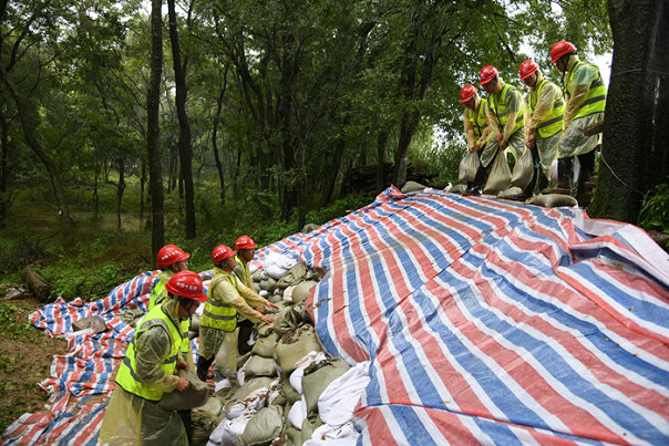 搶險隊(duì)員雨中扛沙袋 呂奎元攝
