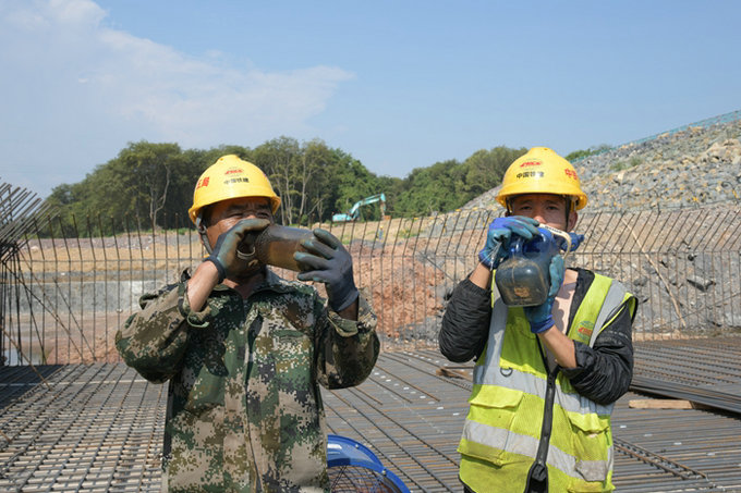 盛夏,工人一天喝下6公斤水 王繼劍攝 開工前,該項(xiàng)目部組織人力和設(shè)備修便道、清除河道兩岸的樹木和雜草,并在工地附近安裝6個(gè)集裝箱供管理、施工人員住宿,安排一名現(xiàn)場管理經(jīng)驗(yàn)豐富的老同志負(fù)責(zé)大橋施工全面管理,為大橋開工做了充分準(zhǔn)備。為加快施工進(jìn)度,近日還將增加人力和設(shè)備,開挖橋臺(tái)與筑圍堰樁基施工同步展開,利用干旱大好時(shí)機(jī),掀起施工大干熱潮,早日完成水下樁基任務(wù),為橋墩施工創(chuàng)造條件。