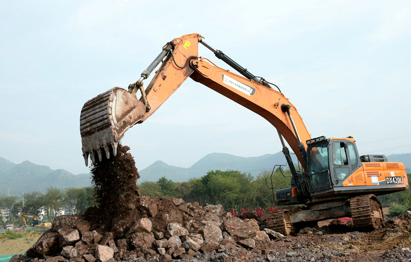 挖掘機作業(yè) 孫永現(xiàn)攝白虎灘樞紐位于常山縣樊溪村上游200米處,主要工程量為1座電站,15孔14米寬、7米高泄洪閘、應(yīng)急過船設(shè)施、船閘、主副廠房等。因項目一半建在常山江河道上,必須先進行圍堰施工,待圍堰具備抵擋洪水沖擊能力,樞紐各分項工程方可進入施工程序。另外,常山江每年4—7月份為每年的主汛期,暴雨和上游20多座水庫泄洪導(dǎo)致常山江水流暴漲、湍急,最大洪峰水位將升高6—8米,座落在江水中的泄洪閘、船閘等必須停工給洪水讓路,汛期過后再復(fù)工,與其它3座樞紐情況一樣。