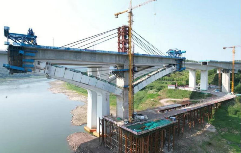 據項目總工程師南迎軍介紹,作為國內首座鋼-混混合式梁拱組合剛構橋,大橋三角區(qū)合龍,標志著該橋重難點關鍵技術實現了突破,為大橋全面合龍建成打下了堅實基礎,這是取得階段性的科研成果,目前己創(chuàng)造了國內首座大跨度鋼-混混合式梁拱組合剛構橋采用鋼斜撐空腹連續(xù)剛構的結構形式的先河,將為后續(xù)類似橋梁施工積累了經驗,具有非常重要指導性意義。重慶軌道交通15號線廖家溪軌道專用橋,橋梁位于15號線井口站至禮學路站區(qū)間,處于已建重慶市政道路禮嘉嘉陵江大橋下游附近,相距約13.2米,大橋全長804.9米,跨嘉陵江,與禮嘉嘉陵江大橋對孔布置,主墩墩身高72米,主跨245米,橋面寬度為13.6米,是全線的重難點、關鍵控制性工程,堪稱“神洲第一橋”。
