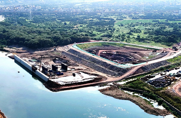 招賢樞紐是中鐵十五局常山江航電4座樞紐中的一座,主要工程有:縱向混凝土導(dǎo)流墻、18孔泄洪閘、1座發(fā)電站、電站管理區(qū)、廠房、上下游防洪堤等配套工程。該樞紐去年9月率先開工,項(xiàng)目部出動(dòng)大型機(jī)械和車輛,利用黃土、鋼管、砂石和塊石筑起一座長400多米、底寬25米、高10米的三角形堤壩,將三分之一的常山江河流分割開來,并調(diào)集4臺(tái)大型抽水機(jī)將幾萬立方水排出,為166米長的1座導(dǎo)流墻和18孔泄洪閘墩其中4個(gè)首節(jié)施工掃了障礙。在基礎(chǔ)開挖中,地下水位高、涌水量大,加之隔三差五下一場(chǎng)雨等不利條件,該項(xiàng)目部采取邊施工邊啟用3臺(tái)大型抽水機(jī)24小時(shí)不停排水的辦法解決了大涌水難題。按照施工計(jì)劃,今年4月下旬先后完成了導(dǎo)流墻和4個(gè)11.3米高(含基座)的泄洪閘墩首節(jié)主體。