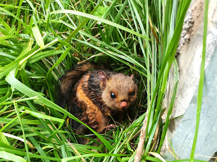 據(jù)員工劉浩回憶:當日上午9時54分,他正沿著站房周邊進行例行巡查,突然發(fā)現(xiàn)一團黑影“飛”進路邊綠化帶,走近才看清是一只有著白棕色相間皮毛、長胡須、大眼睛、像浣熊又像松鼠的小動物。由于這只小動物蹲在草叢里一動不動,不確定是受傷或受到驚嚇;考慮到高速上車流大、車速快,為防止這只小動物受到意外傷害,他和同事們使用網(wǎng)兜合力將其控制、放入網(wǎng)籠中悉心照看。青溪林業(yè)站接到電話后派出工作人員,經(jīng)仔細觀察后確認這只小動物為國家二級保護動物野生大型鼯鼠,當?shù)厮追Q“飛狐”“松貓兒”。