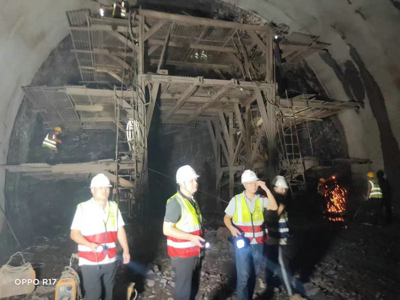 項目黨支部書記韓崇生(左二)組織黨員干部在中梁山隧道進口掌子面進行安全檢查