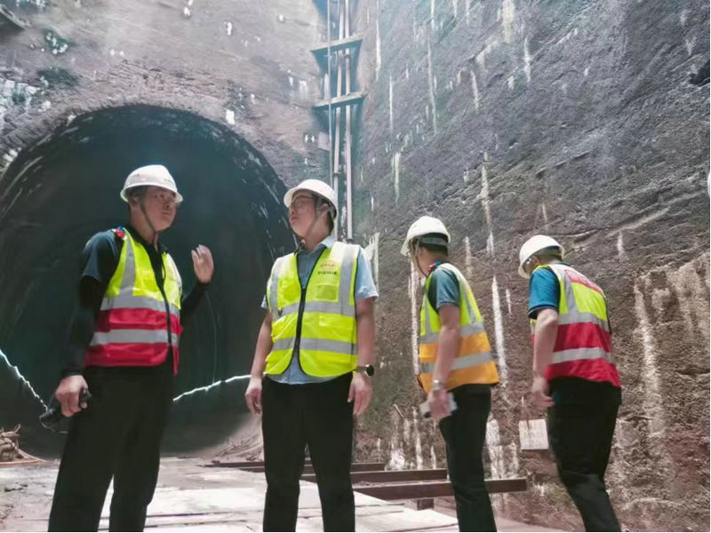 項目安全總監(jiān)高超德(右二)陪同項目部黨政主管領導在中梁山隧道進口進行安全檢查