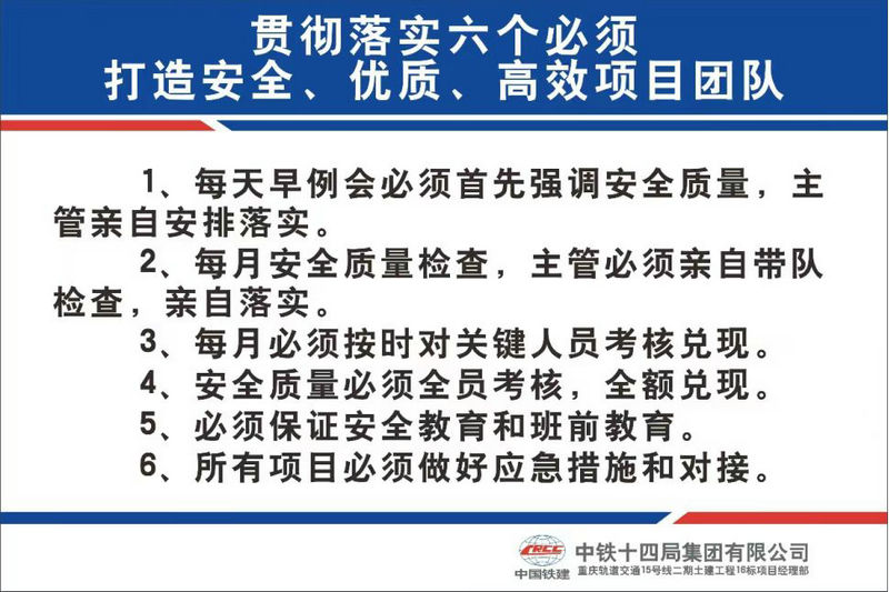 在施工進(jìn)入下半場(chǎng)攻堅(jiān)階段,為推進(jìn)精細(xì)化管理落地生根,安全優(yōu)質(zhì)高效完成年度目標(biāo)任務(wù)。中鐵建重慶軌道交通15號(hào)線二期總承包部16標(biāo)項(xiàng)目部,居安思危時(shí)刻繃緊安全主弦,通過(guò)創(chuàng)新工程早例會(huì)工作手法,積極推行“六個(gè)必須”安全管理制度,與會(huì)人員通過(guò)每早“六個(gè)必須”須知須會(huì),進(jìn)一步促進(jìn)了對(duì)口工作的一口清和兩手硬,既提高了工程早例會(huì)的質(zhì)量,又有效地保證了對(duì)施工安全的把控、質(zhì)量的受控和創(chuàng)效的可控。