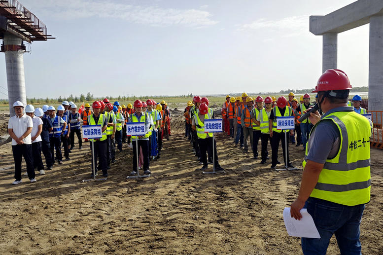 此次應(yīng)急演練情景設(shè)定在阿阿高速項(xiàng)目塔里木河特大橋蓋梁施工現(xiàn)場,一名施工人員因未正確系掛安全帶,導(dǎo)致腳下踩空后從高空墜落,造成小腿骨折,面部有外傷出血,情況緊急。“事故”發(fā)生后,作業(yè)現(xiàn)場迅速啟動(dòng)了應(yīng)急響應(yīng)機(jī)制。現(xiàn)場安全員迅速評估情況并布置現(xiàn)場警戒,同時(shí)上報(bào)事故。應(yīng)急總指揮依據(jù)事故嚴(yán)重程度,果斷啟動(dòng)應(yīng)急救援預(yù)案,各救援小組按照各組職責(zé)有序開展救援行動(dòng),并將現(xiàn)場救援情況實(shí)時(shí)匯報(bào)。