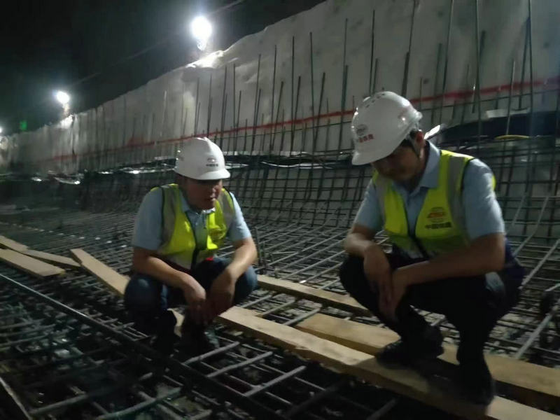 項目部經(jīng)理阮超(左)工程部長牛浩(右)對隱蔽工程鋼筋施工檢查