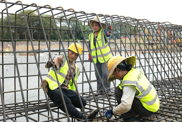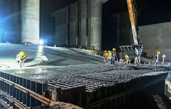 常山江航電樞紐就像人的“五官”,消力池是其中一個(gè)“器官”,從外到內(nèi)不能有瑕疵。在澆注混凝土?xí)r,項(xiàng)目部采取長臂挖掘機(jī)將自卸車傾倒進(jìn)鋼結(jié)構(gòu)池的混凝土挖運(yùn)至鋼筋網(wǎng)內(nèi),并由人工操持振動棒、抹子搗固密實(shí)、抹平。