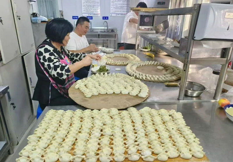 隨后,大家一起動(dòng)手包餃子。面粉是今年豐收的小麥研磨而成,餃子餡兒里的韭菜是新割的秋韭。大家分工協(xié)作、井然有序,一邊包餃子,一邊話家常,在歡笑中相互切磋著包餃子的技巧,食堂里歡歡喜喜、熱熱鬧鬧。