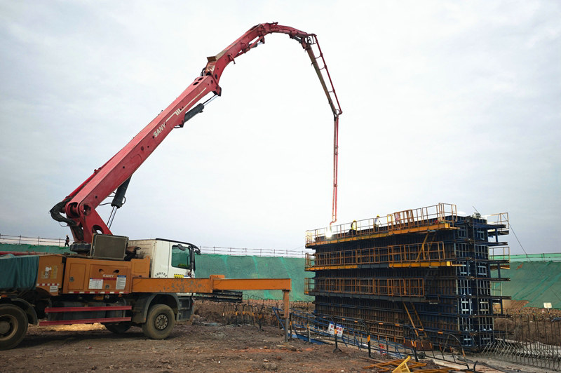 這座導(dǎo)流墻工全長182米、高7.4米、寬2.6米,由8段構(gòu)成,分段進(jìn)行綁扎鋼筋籠、澆注混凝土。該項(xiàng)目充分發(fā)揮人力與機(jī)械優(yōu)勢,火力全開,挖掘機(jī)與破碎機(jī)并用,力克地下涌水、泥巖、砂巖,開挖出一個(gè)長方形大基坑。然后緊鑼密鼓地進(jìn)行11倉中的首倉鋼筋混凝土澆注。隨著一倉倉混凝土基礎(chǔ)的完工,馬上突擊完成墻體鋼筋網(wǎng)與混凝土作業(yè)。