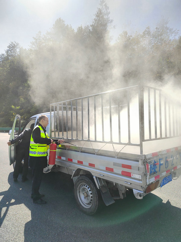 當(dāng)日13時53分,一輛平板式貨車行駛至廣平高速樂安收費站出口,收費員吳金鳳發(fā)現(xiàn)車箱有濃煙冒出,立即告知司機火情,引導(dǎo)著火車輛駛?cè)刖o急避險位置,并及時報告監(jiān)控中心和值班站管;另一方向的入口收費員王陽澤曦看到后,立即攜帶手持式滅火器跑到著火車輛處第一時間進行撲救;聽到火情通報后,收費站其余人員按照預(yù)案趕赴現(xiàn)場參加處置。經(jīng)過約十分鐘全力撲救,火情被徹底撲滅,無人員受傷,車上貨物大部得到挽回。