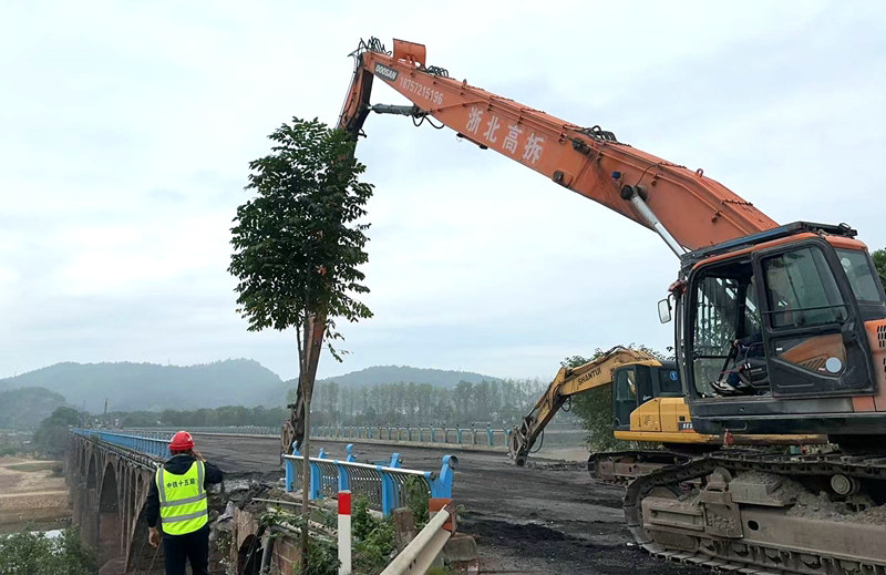 為安全拆除富足山大橋,該項(xiàng)目團(tuán)隊(duì)制定科學(xué)的拆除方案,并取得業(yè)主、駐地交警部門的大力支持。同時(shí),他們選用經(jīng)驗(yàn)豐富的拆橋隊(duì)進(jìn)駐現(xiàn)場,在一側(cè)搭設(shè)一座棧橋,便于挖掘機(jī)、吊車等大型機(jī)械設(shè)備作業(yè),并采取先拆除自來水管道、光纜、電纜、網(wǎng)線等多條管線以及防護(hù)欄、橋面,后進(jìn)行炮擊的方法,“智取”依附于大石拱上方的46個(gè)小石拱,再攻克承重大石拱,從兩頭向中間合圍。在安全保障方面,他們除在大橋兩端設(shè)立警示牌,安排員工參加由交警授課的培訓(xùn)班,掌握指揮車輛和行人的規(guī)范動作外,另組織員工手拿小旗、身穿反光背心,輪流在大橋兩端路口指揮交通,以防有人“沖卡”進(jìn)入。此外,他們對拆橋作業(yè)人員集中進(jìn)行崗前安全教育培訓(xùn),并安排專職安全員對拆除全過程進(jìn)行重點(diǎn)盯控。