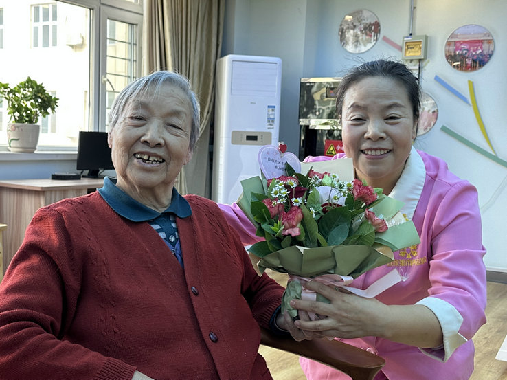 85歲的賈秀花奶奶,患有阿爾茨海默癥,兒女都不認識了,卻記得天天照護她的護理員謝水蓮。“奶奶特別喜歡讓我給她梳各種發(fā)型,我一叫她‘氣質(zhì)奶奶’,她就呵呵笑。”謝水蓮說。