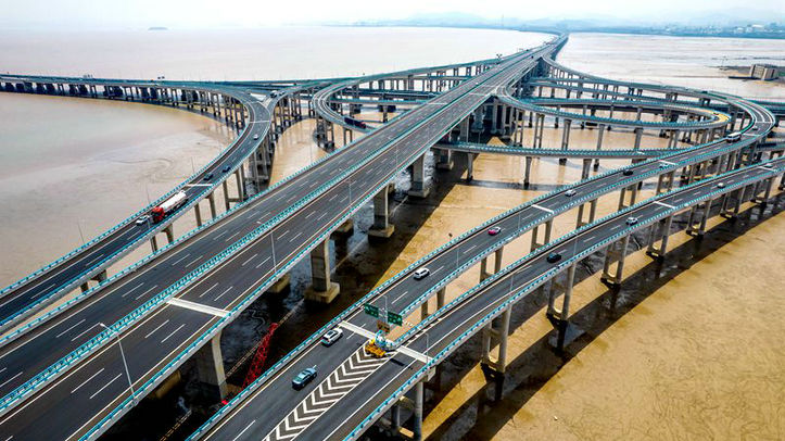 中鐵十五局承建的杭甬高速復(fù)線寧波一期S3合同段濱海高架、濱?;ネㄈL14.6公里,占海面積613.03畝,樁基1739根,承臺348座,橋墩812座,其中濱?;ネㄊ莵喼拮畲蟮暮I匣ネ?全長9705米,由8條匝道、4座拼寬、1座主線橋組成,3條匝道上跨既有高速跨海金塘大橋,安全風(fēng)險高。由于兩座橋地處寧波鎮(zhèn)海淺海水域,必須搭建一座海上鋼棧橋。為保證濱海高架、濱?;ネㄊ┕ろ樌M行,從2019年8月份開工以來,該公司通過招標(biāo),選用幾家海上搭建棧橋經(jīng)驗豐富的隊伍,采取對方出人、出設(shè)備、出材料、負責(zé)搭建和拆除、該公司出租金的方式,在海上搭建全長14.6公里、寬9米、高6.5米、由鋼管、角鋼、貝雷架、鋼板等21萬噸鋼材構(gòu)成的棧橋和作業(yè)平臺。為節(jié)省租賃費,從濱海高架開始,每完成幾座橋墩,便馬上交業(yè)主、監(jiān)理單位檢查驗收,待簽字確認,給棧橋施工單位下達拆除通知,不再支付費用。濱海高架樁基、承臺和橋墩施工結(jié)束不久,棧橋也隨之拆除完畢。轉(zhuǎn)入濱?;ネㄊ┕ず螅鶕?jù)橋墩、架梁推進情況,搭設(shè)的棧橋和平臺除滿足施工外,其余及時通知棧橋隊拆除,避免棧橋和平臺閑置,僅這一項節(jié)約不菲的租賃費。海上棧橋和作業(yè)平臺助力濱海高架、濱海互通順利完成兩座大橋的樁基、承臺、橋墩、架梁和橋面施工任務(wù),為2023年12月8日順利交工、2024年1月19日正式通車運營發(fā)揮了作用。
