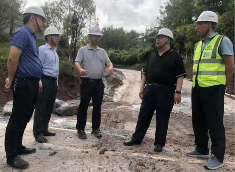 總承包部黨工委書記王向平(右1)、指揮長(zhǎng)李兵(右2)、副指揮長(zhǎng)陳華富(左3)、李燕斌(左2)在施工現(xiàn)場(chǎng)調(diào)研