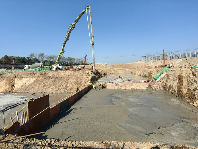 天馬樞紐泄洪閘基礎(chǔ)平整后,分段采用混凝土罐車與泵車聯(lián)手的辦法完成了混凝土澆注,為下一道工序底板鋼筋混凝土施工埋下伏筆。