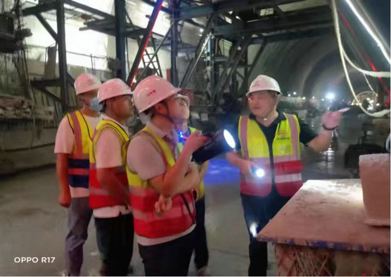 16標項目黨支書記韓崇生(右1)組織黨員干部深入隧道掌子面排隱患(杜曉言攝)