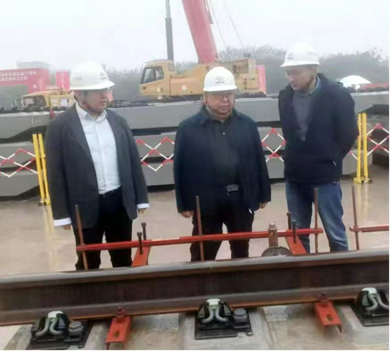總承包部指揮長李兵(左2)與19標項目軌道工程負責人徐新明(左1)、項目經理王磊(右1)在鋪軌現場檢查