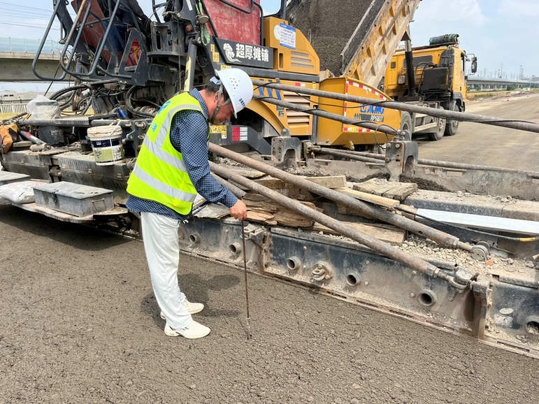 (圖說:2024年12月1日安徽固鎮(zhèn)EPC市政項目經(jīng)五路水泥穩(wěn)定碎石下基層攤鋪松鋪厚度監(jiān)理工程師抽檢施工 善忠俊攝)
