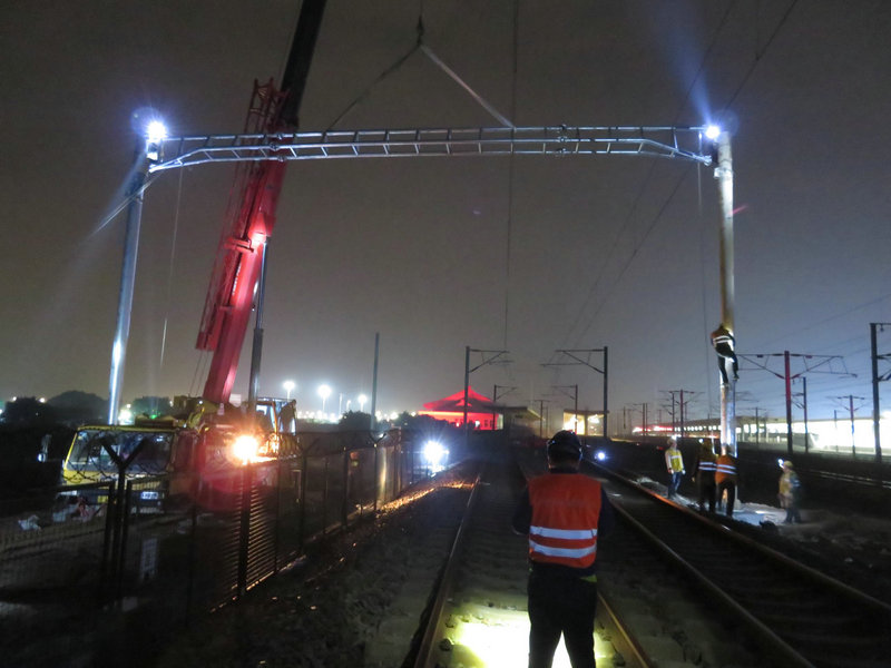 從施工準(zhǔn)備,班前點(diǎn)名,接到封鎖停電命令后,大家進(jìn)場(chǎng)進(jìn)行驗(yàn)電接地,頃刻間施工現(xiàn)場(chǎng)人影攢動(dòng),安全帽及防護(hù)服身上的反光條在燈光的照耀下,成為夜色中最為明亮的標(biāo)識(shí)。接觸網(wǎng)第二架子隊(duì)全員腳踏實(shí)地,在確保施工質(zhì)量和安全的前提下,搶進(jìn)度、趕工期,從凌晨12點(diǎn)到2:40,在電氣化項(xiàng)目部安全總監(jiān)金加?xùn)|、安質(zhì)部副部長(zhǎng)潘果果的盯控下,現(xiàn)場(chǎng)管理人員與施工人員齊心協(xié)力,爭(zhēng)分奪秒,經(jīng)過(guò)了兩個(gè)多小時(shí)的施工,完成接觸網(wǎng)支柱組立2根,硬橫梁架設(shè)1組,PW線(xiàn)肩架安裝1套,支柱打孔101#、104#各4個(gè),拉線(xiàn)安裝4根,架設(shè)6-40#至134#間過(guò)渡PW線(xiàn)530米,安裝下錨底座2套。在有限的時(shí)間內(nèi)順利完成了本次天窗施工任務(wù)。施工完畢后,安全防護(hù)員對(duì)現(xiàn)場(chǎng)內(nèi)外進(jìn)行仔細(xì)檢查確認(rèn),對(duì)施工廢棄物、遺留工具或垃圾及時(shí)清理干凈,組織人員安全撤出,為本次天窗施工畫(huà)上圓滿(mǎn)的句號(hào)。