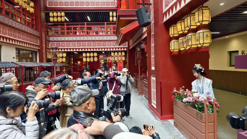 活動(dòng)現(xiàn)場(chǎng),攝影愛好者們?cè)谔┖屠?ldquo;唐宋夢(mèng)華”街區(qū)中心舞臺(tái)拍攝了儺舞、豫劇、花月宴等精彩的節(jié)目表演,在街區(qū)打卡點(diǎn)和火車主題公園拍攝了演員、模特特寫,定格了古裝演員和模特們美輪美奐的絢爛瞬間。
