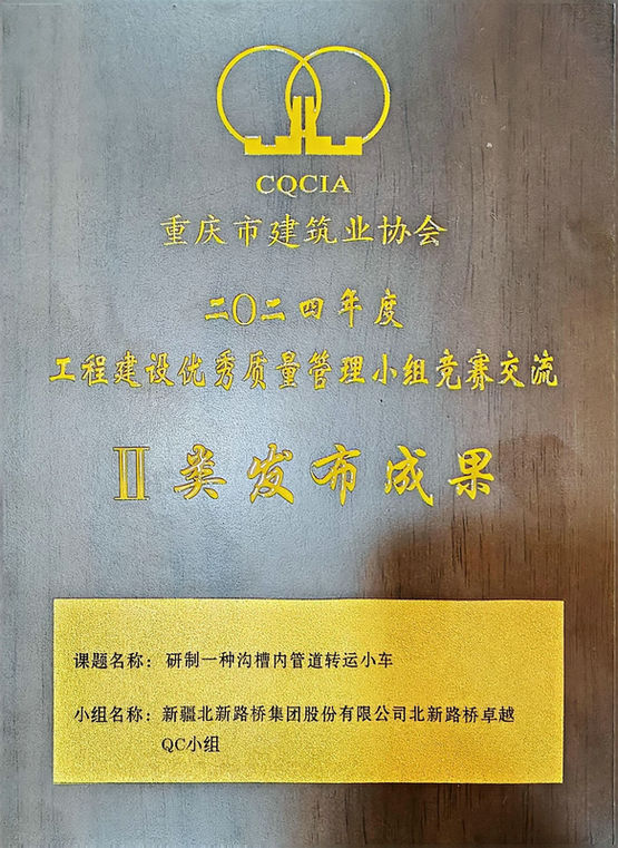 近日,從重慶市建筑業(yè)協(xié)會(huì)(以下簡(jiǎn)稱“重慶建協(xié)”)傳來喜訊,北新路橋集團(tuán)西安分公司內(nèi)江鄉(xiāng)村水務(wù)示范縣建設(shè)項(xiàng)目申報(bào)的《研制一種溝槽內(nèi)管道轉(zhuǎn)運(yùn)小車》QC成果憑借創(chuàng)新的技術(shù)應(yīng)用、扎實(shí)的實(shí)踐成效和突出的行業(yè)價(jià)值,在2024年度重慶市工程建設(shè)質(zhì)量管理小組活動(dòng)成果評(píng)選中脫穎而出,榮獲“一類成果獎(jiǎng)”與“二類發(fā)布成果獎(jiǎng)”兩項(xiàng)殊榮。