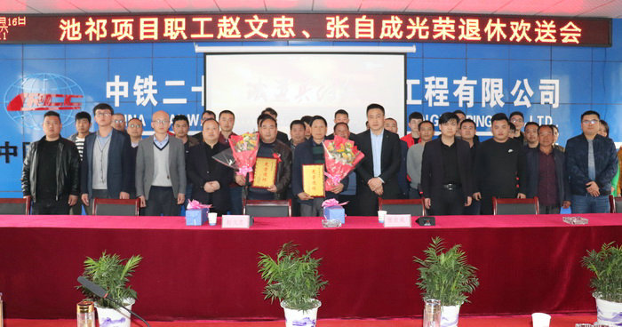本網(wǎng)安徽黃山3月18日訊(通訊員 王克亮 唐小梅)近日,中鐵二十一局三公司池祁項目部為退休職工趙文忠、張自成兩老同志舉行光榮退休歡送會,感謝他們數(shù)十年來為企業(yè)的辛勤付出。項目部全體員工參加歡送會并依依話別。