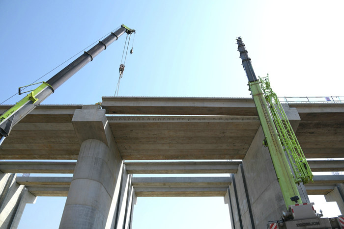 兩臺吊車合力架梁 郝偉亮攝