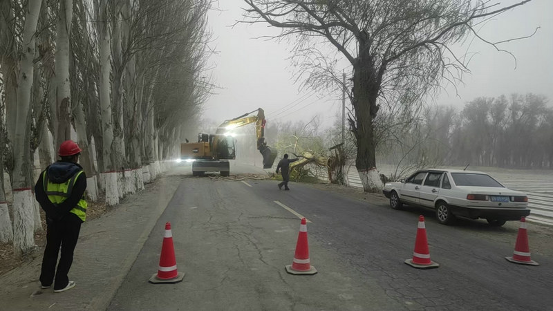 3月26日,一場突如其來的大風(fēng)沙塵暴席卷阿拉爾市,導(dǎo)致阿阿高速項(xiàng)目部二分部駐地十二團(tuán)六連附近樹木傾倒,中斷309省道交通。得知險(xiǎn)情,中鐵二十一局阿阿高速項(xiàng)目部迅速啟動應(yīng)急預(yù)案,就近調(diào)派挖掘機(jī)、裝載機(jī)各1臺,組織10余名搶險(xiǎn)隊(duì)員趕赴現(xiàn)場,迅速開展道路清障作業(yè)。