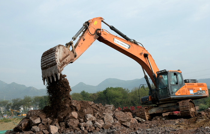 挖掘機儲備圍堰所需石塊 贠煥軍攝