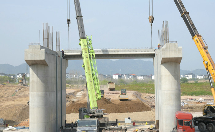 為了安全、高效、優(yōu)質(zhì)地完成導流墻、泄洪閘建設任務,該項目部調(diào)集多臺挖掘機、鏟車、自卸車、推土機、旋噴樁機等機械設備聯(lián)合會戰(zhàn),用泥沙石、鋼管、土工布等材料和1136根旋噴樁,筑起一座長909.55米、高10多米、頂寬6米多的江堤,將常山江河道改變流向。在泄洪閘基礎開挖中,采用破碎錘炮擊的辦法攻克了3米多厚的巖層,使底板、泄洪閘墩首節(jié)、閘墩上部鋼筋混凝土結(jié)構(gòu)得以如期順利進行。去年11月23日,第一個閘墩成功封頂,今年3月底,泄洪閘8個閘墩以及配套的消力池、護坦、閘門槽等全部完成,為架梁創(chuàng)造了條件。