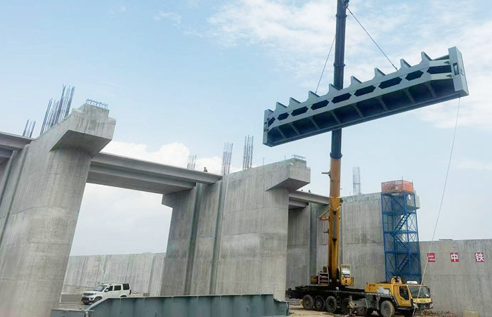 為了高效、安全、優(yōu)質(zhì)地完成泄洪閘閘門施工任務(wù),該項(xiàng)目部擇優(yōu)選用國內(nèi)一家閘門生產(chǎn)廠家定制一扇扇40多噸重的大閘門,并對運(yùn)輸、起吊等全過程采取切實(shí)可行的安全防護(hù)措施,并選擇300噸的汽車吊進(jìn)行吊裝。經(jīng)過精心準(zhǔn)備,第一扇厚重的大鐵門安裝到位。