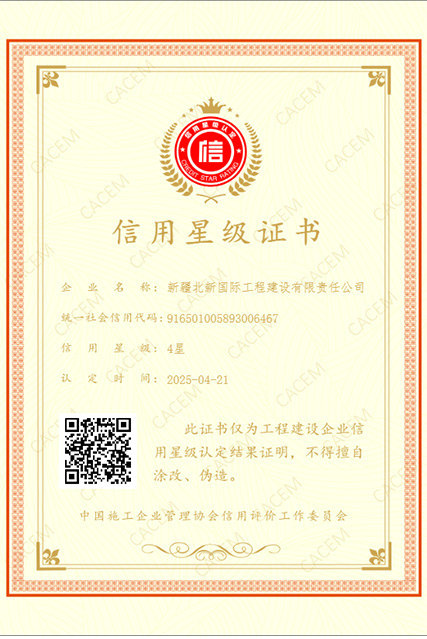 北京訊(通訊員羅鵬程)近日,中國施工企業(yè)管理協(xié)會正式發(fā)布新年度工程建設企業(yè)信用星級認定結(jié)果,新疆兵團建工北新國際憑借卓越的企業(yè)信用表現(xiàn)和扎實的工程履約能力,從三星級成功晉升為四星級信用企業(yè)。本次成功晉級,既是對公司多年來誠信經(jīng)營、規(guī)范管理的高度認可,更是對我司“誠信立企、質(zhì)量強企”發(fā)展理念的充分肯定,標志著我司企業(yè)信用體系建設取得了新的成效。