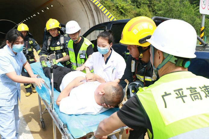 演練背景為,廣平高速青川段突發(fā)地震,平廣向K4+400韓家山隧道洞口上方邊坡垮塌,一輛小轎車躲避不及撞上垮塌物導(dǎo)致車輛受損、人員受傷。