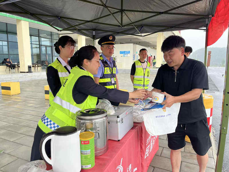恰逢陰雨連綿,服務(wù)區(qū)工作人員為旅客送上自己手工包制的粽子、熱騰騰的茶水和咖啡,還貼心準備了雨傘、簡易雨衣。高速公安、高速執(zhí)法單位人員利用旅客領(lǐng)取粽子、飲品時機發(fā)放交通法宣傳手冊,逐車逐人進行雨天行車安全提醒。