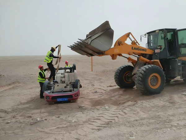項(xiàng)目安全負(fù)責(zé)人王明海,迅速指揮調(diào)配附近的機(jī)械班組開來一臺(tái)裝載機(jī)。裝載機(jī)龐大的身軀在沙漠中如同一頭鋼鐵巨獸,沉穩(wěn)而有力。他一邊安撫傾翻車輛駕駛員的情緒,說到:“別慌,有我們在!”一邊和同伴熟練地將牽引帶固定在車輛上并時(shí)刻專注地檢查固定情況,確保每一個(gè)環(huán)節(jié)都不出差錯(cuò)??釤岬幕哪兴麄兊难凵裰型钢鴪?jiān)定與果敢,汗水順著臉頰滑落,浸濕了領(lǐng)口,卻絲毫沒有影響他們救援的動(dòng)作。