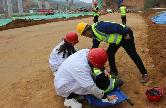 本次應(yīng)急救援活動共分六個小組,分別是通訊聯(lián)絡(luò)組、后勤保障組、緊急疏散組、搶險救援組、現(xiàn)場警戒組、醫(yī)療救護(hù)組。演練開始前,雷總召集應(yīng)急救援小組相關(guān)人員召開專題預(yù)備會議,說明本次組織演練活動的目的、意義、要求并分配了工作任務(wù)。各小組準(zhǔn)備就緒,等待指令?,F(xiàn)場模擬的是徐老莊互通橋G匝道施工現(xiàn)場有一名施工人員不慎從橋墩墜落,傷勢不明,請求支援?,F(xiàn)場接到指令后,根據(jù)《高空墜落應(yīng)急救援演練方案》,項目部立即啟動應(yīng)急救援,副指揮長隨即撥打市120急救中心電話,醫(yī)療救護(hù)組人員迅速準(zhǔn)備擔(dān)架、急救箱等醫(yī)療設(shè)備趕往事故現(xiàn)場,對其受傷的右腿及頭部傷口進(jìn)行處理;現(xiàn)場警戒組在現(xiàn)場拉起警戒線,開始疏散圍觀人群;搶險救援組隨即進(jìn)入,清理周邊材料,避免二次傷害;隨后,緊急疏散組及時到達(dá)現(xiàn)場,疏通救援通道,引導(dǎo)救護(hù)車輛進(jìn)入事故現(xiàn)場;通訊聯(lián)絡(luò)組及后勤保障組保持通訊通暢,配合現(xiàn)場救援。各小組配合默契、處理得當(dāng)、反應(yīng)迅速,圓滿的完成了救援任務(wù)。15時35分,演練結(jié)束,各小組成員返回指揮中心。