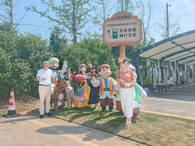 踏入S39渝長復線高速長壽服務(wù)區(qū)充電站,迎面而來的是極具視覺沖擊力的文化景觀:標志性的阿凡提頭戴花帽、騎著毛驢,正向過往車輛熱情招手;三位身著絢麗民族服飾的青年以歡快的歌舞,為駛?cè)敕?wù)區(qū)的司乘送上最誠摯的歡迎。這一場景打破了傳統(tǒng)充電站冰冷的科技感,讓每一位途經(jīng)此地的車主都能感受到溫暖與驚喜。
