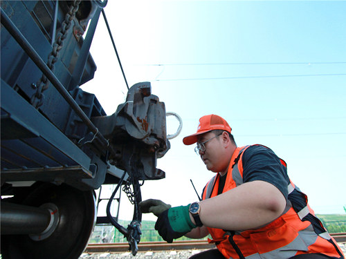 7月22日,在中鐵一局集團新運公司準格爾鐵路公司管內(nèi)三道渠站,00后連接員孫凱全副武裝,正躬身俯向滾燙的車鉤,此時他準備摘解一組剛剛停穩(wěn)的萬噸列車。只見汗水順著他通紅的臉頰不?;?,滴落在道砟上后,便瞬間消失無蹤。這條“火線”上,每一滴汗水都在與高溫進行著無聲的較量。