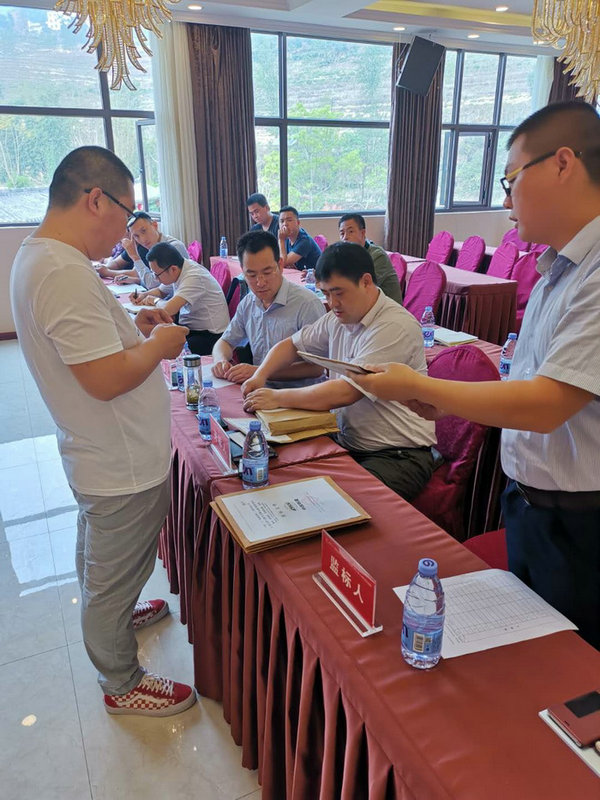 圖為供應(yīng)商向評委遞交招標(biāo)文件 據(jù)了解,仁沐新高速公路LJ16標(biāo)項(xiàng)目部共需采購彩鋼房5000平方米、輕鋼料棚1.77萬平方米、全封閉圍擋9000平方米,共需700多萬元。通過各供應(yīng)商報價、產(chǎn)品質(zhì)量、評標(biāo)篩選打分,項(xiàng)目部優(yōu)中選優(yōu),擬確定兩家供應(yīng)商為中標(biāo)單位。