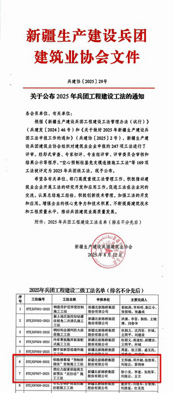 南平訊(通訊員 王立、王邦滿)近日,新疆生產(chǎn)建設(shè)兵團(tuán)建筑業(yè)協(xié)會(huì)公布2025年度兵團(tuán)級(jí)(省部級(jí))工法成果,北新路橋集團(tuán)福建分公司2項(xiàng)工法成功入選,至此該分公司本年度已累計(jì)有3項(xiàng)工法獲得省部級(jí)認(rèn)證。