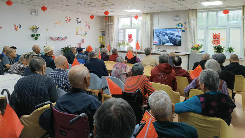 上午9時(shí),老人們便早早來(lái)到活動(dòng)大廳,滿懷期待地坐在電視機(jī)前。當(dāng)莊嚴(yán)的國(guó)歌響起,全體老人和工作人員自發(fā)起身,神情肅穆,齊聲高唱國(guó)歌,向國(guó)旗致以最崇高的敬意。那一刻,愛(ài)國(guó)之情在每個(gè)人心中澎湃。