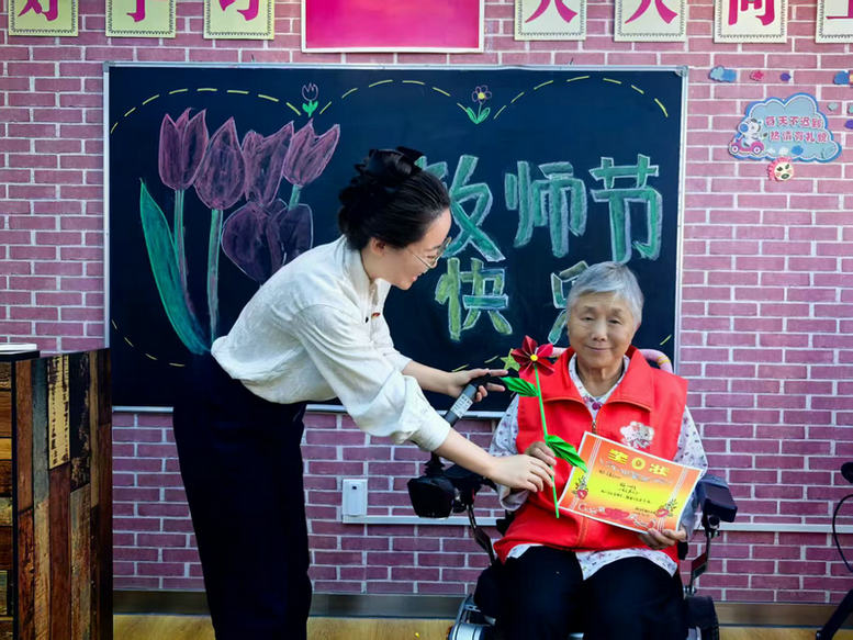當(dāng)《聽我說謝謝你》的音樂響起,32 位爺爺奶奶跟著節(jié)奏擺動雙手,有的老人動作雖慢,卻格外認(rèn)真,小紅花在他們手中輕輕晃動,像一朵朵綻放的暖陽。“以前覺得教師節(jié)是年輕人的事,沒想到我們也能過!” 張桂蘭奶奶笑著說,“護(hù)理員們比自家孩子還耐心,跟著他們學(xué)東西,心里暖和得很。”?