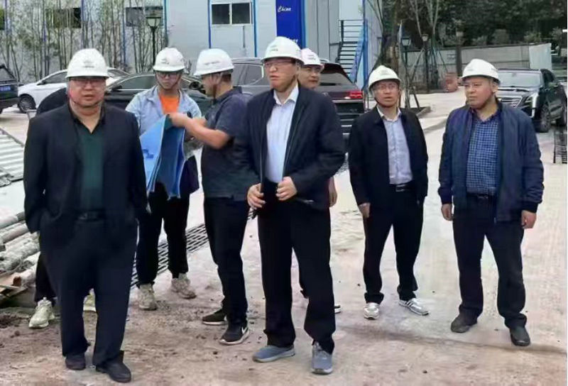 總承包部指揮長(zhǎng)李兵(左1)、黨支部書(shū)記王向平(左2)、副指揮長(zhǎng)李燕(右2)、工程管理部經(jīng)理鄧林義(右2)在現(xiàn)場(chǎng)巡查督導(dǎo)
