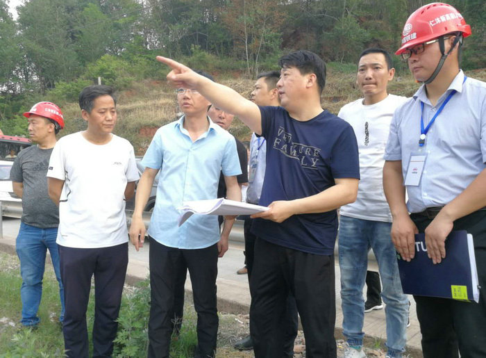 4月25日,莊乾理董事長(zhǎng)在對(duì)管區(qū)沿線進(jìn)行現(xiàn)場(chǎng)踏勘時(shí),與前來(lái)檢查工地的仁沐新高速公路有限公司董事長(zhǎng)劉勇、總經(jīng)理姜杰明、副總經(jīng)理向可明一行巧遇。在現(xiàn)場(chǎng),業(yè)主方聽(tīng)取了項(xiàng)目負(fù)責(zé)人關(guān)于LJ16標(biāo)段情況介紹,以及項(xiàng)目部臨時(shí)設(shè)施場(chǎng)站規(guī)劃情況匯報(bào)。然后,莊乾理董事長(zhǎng)就項(xiàng)目總體規(guī)劃部署及施工思路與仁沐公司董事長(zhǎng)劉勇進(jìn)行了交流。