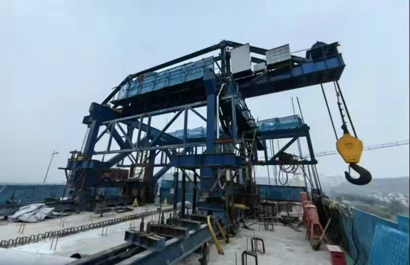 大橋采用鋼斜撐空腹連續(xù)剛構(gòu)的結(jié)構(gòu)形式,在國內(nèi)軌道交通橋梁建設(shè)中尚屬首例,鋼混混合式剛構(gòu)橋常規(guī)施工方法為先施工下弦鋼斜撐節(jié)段,后施工對應(yīng)的上弦混凝土節(jié)段,施工周期長,上下交叉作業(yè)安全風(fēng)險(xiǎn)高,且普通掛籃結(jié)合汽車起重機(jī)吊裝易受施工空間限制,經(jīng)濟(jì)性差。為研發(fā)“大橋掛吊一體裝置”關(guān)鍵技術(shù),總承包部副指揮長兼總工程師楊振在總承包部指揮長李兵、黨支部書記王向平等領(lǐng)導(dǎo)的重視支持下,他組織由中國鐵建重慶軌道交通15號線總承包部、中鐵建重慶投資集團(tuán)、重慶交通大學(xué)、中鐵建大橋局集團(tuán)三公司等單位聯(lián)合組成的科技研發(fā)團(tuán)隊(duì),圍繞“大橋掛吊一體裝置關(guān)鍵技術(shù)研究”課題立項(xiàng)研發(fā)。經(jīng)過團(tuán)隊(duì)探索研究,掛吊一體裝置在掛籃主桁架上方設(shè)置一臺吊機(jī)形成吊裝系統(tǒng),吊裝系統(tǒng)包含天車及吊具系統(tǒng),可用于下弦鋼斜撐吊裝施工;通過對掛籃的改進(jìn),同時(shí)滿足上弦箱梁和下弦鋼斜撐施工。