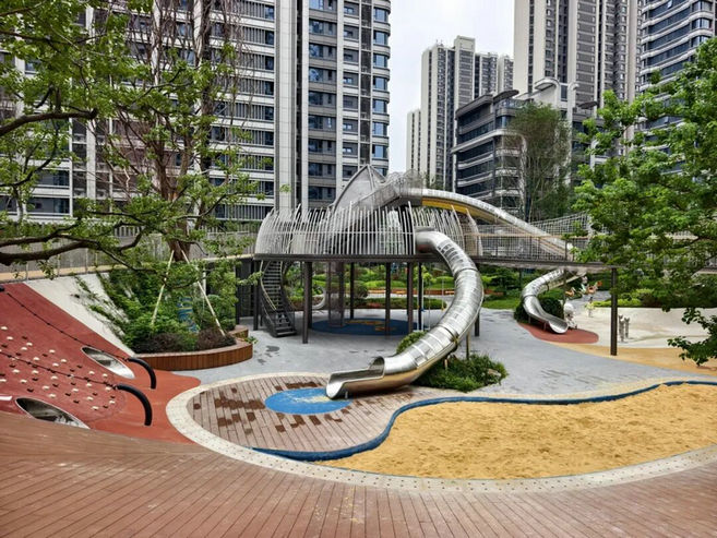 作為社區(qū)親子生活的重要補(bǔ)充,“尋寶森林”主題兒童游樂(lè)場(chǎng)以童趣視角打造沉浸式體驗(yàn):色彩斑斕的“堅(jiān)果城堡”成為孩子們的歡樂(lè)據(jù)點(diǎn),歡樂(lè)蹦床、探險(xiǎn)攀爬網(wǎng)與木棧道、玻璃棧道組成趣味“森林闖關(guān)”路線,各式滑滑梯串聯(lián)起“叢林穿梭 樂(lè)趣,更有專為低齡兒童設(shè)計(jì)的蹺蹺板、搖搖馬。開(kāi)放當(dāng)日,業(yè)主們紛紛攜子女體驗(yàn),孩子們?cè)谠O(shè)施間穿梭嬉戲,稚嫩歡笑聲回蕩社區(qū),為秋日增添滿滿暖意。
